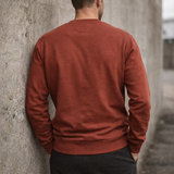 The State Sweatshirt in Earth Red — a clean-cut heavyweight organic cotton crewneck with subtle fluro embroidery and lasting structure. Built for everyday wear, designed to stand apart.